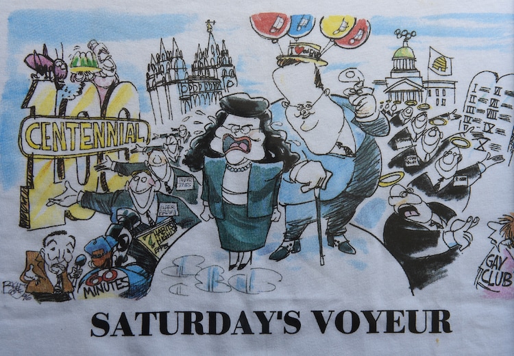 (Francisco Kjolseth | The Salt Lake Tribune) Classic posters, shirts and memorabilia captured the history of "Saturday's Voyeur" as it celebrated its 40th anniversary of skewering Utah life, politics and religion through musical satire.