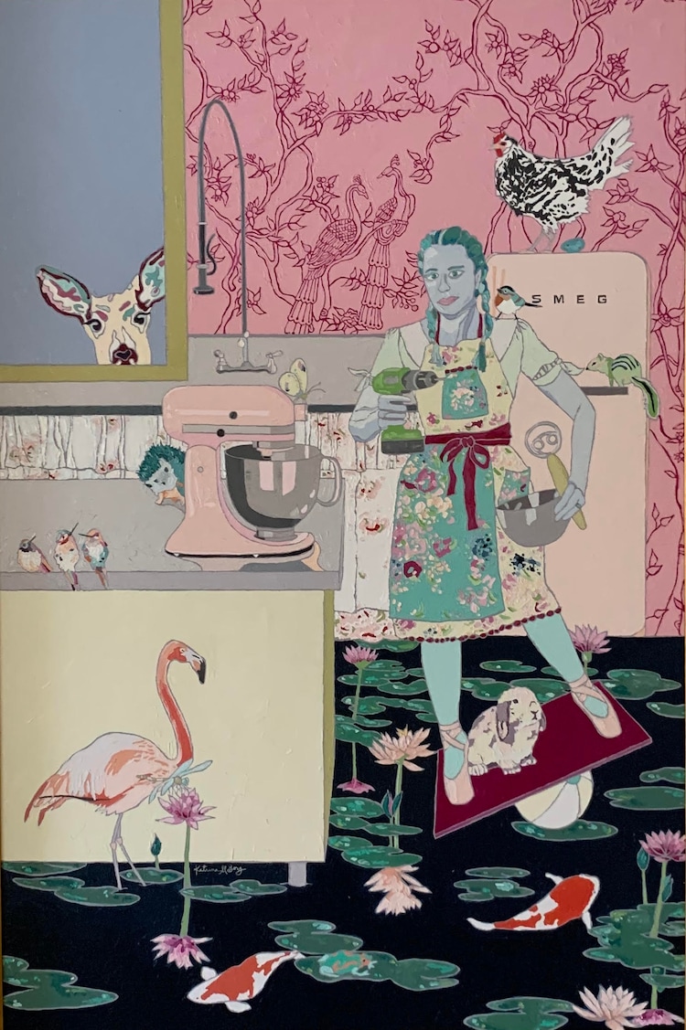 One painting shows a woman in a kitchen holding a power drill and a bowl as she balances on a board on top of a ball. Another shows a woman wearing a yellow dress and tiara as she puts on makeup with a beehive in the background. A third display features live birds in a cage.