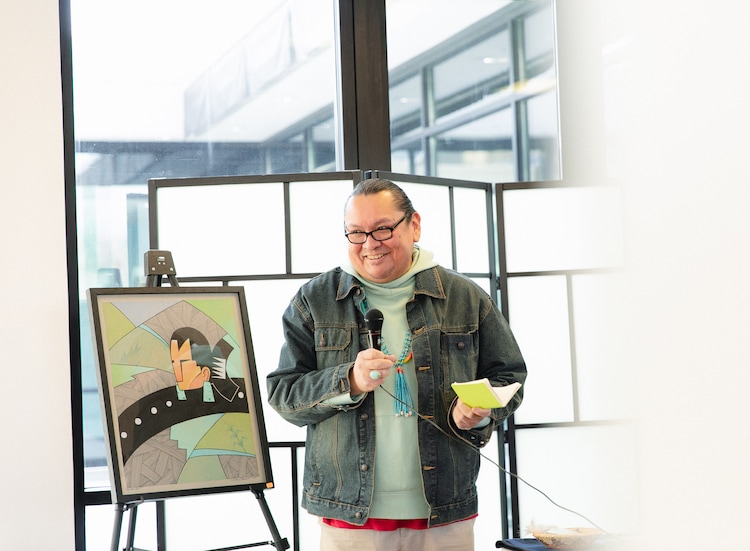 (Rachel Rydalch | The Salt Lake Tribune) Artist Michael Haswood (Diné), speaks at the Utah Diné Bikéyah's Indigenous art gallery grand opening, Saturday, Feb. 26, 2022.