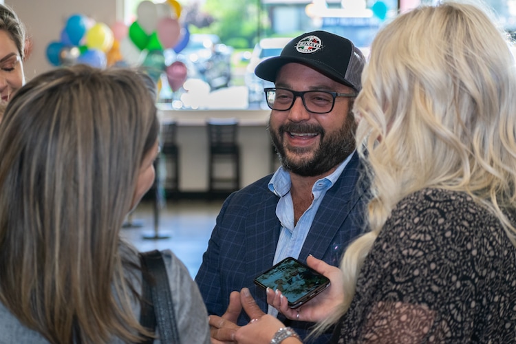 (courtesy Block Party 2700) Owner Frank Granato, center, talks with visitors at the opening for Block Party 2700, a food hall in Holladay, on June 2, 2022.