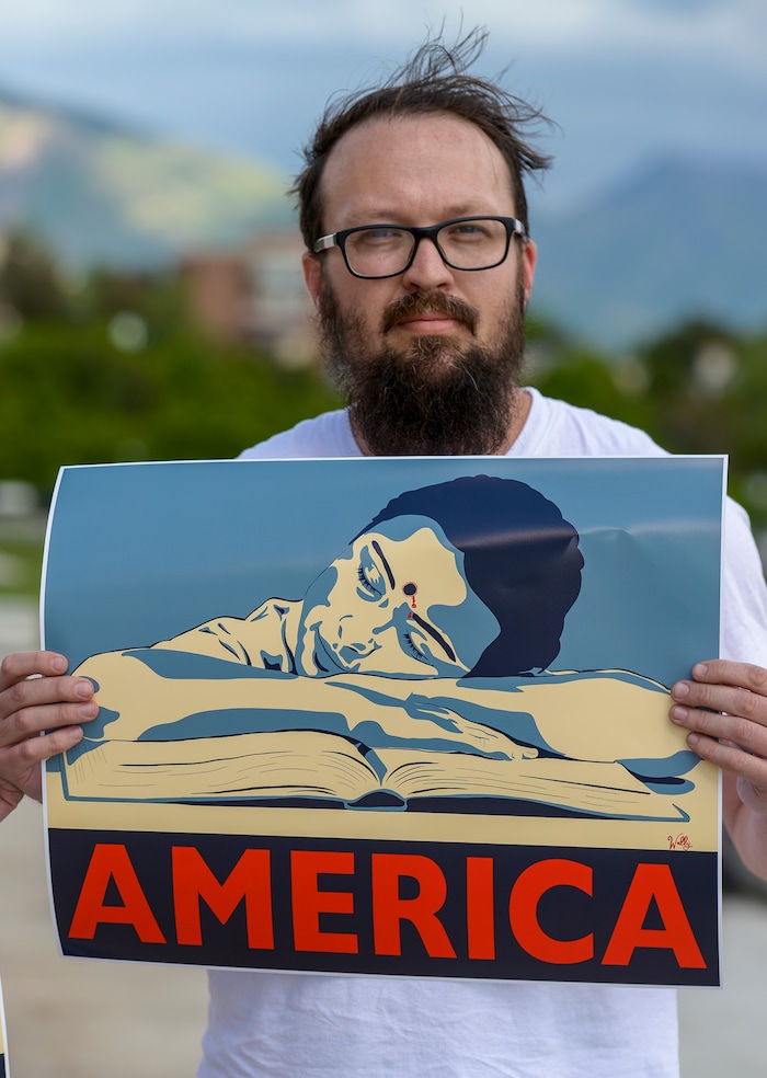(Leah Hogsten | The Salt Lake Tribune) "I'm tired of the violence, especially toward kids," said Wally McGovern who holds a freshly printed poster he designed and had made Friday, May 18, 2018 after the 22nd school shooting of 2018. Members of March For Our Lives SLC members and concerned citizens gather at the Utah Capitol, to demand gun reform and honor the 10 dead who were killed during Friday morning's shooting spree inside Santa Fe High School in southeast Texas.