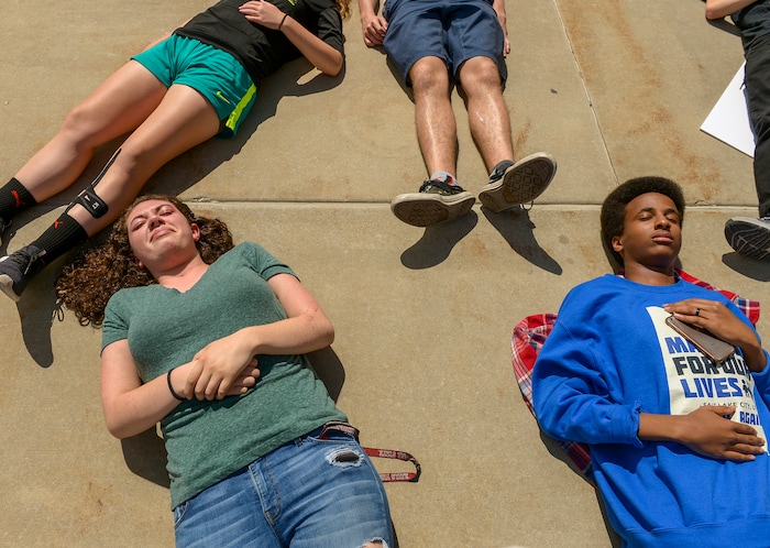 (Leah Hogsten | The Salt Lake Tribune) West High School freshman Zoey Doulson participates in the 22-minute die-in for the 22 school shootings already in 2018. Members of March For Our Lives SLC members and concerned citizens gather at the Utah Capitol, Friday, May 18, 2018, to demand gun reform and honor the 10 dead who were killed during Friday morning's shooting spree inside Santa Fe High School in southeast Texas.