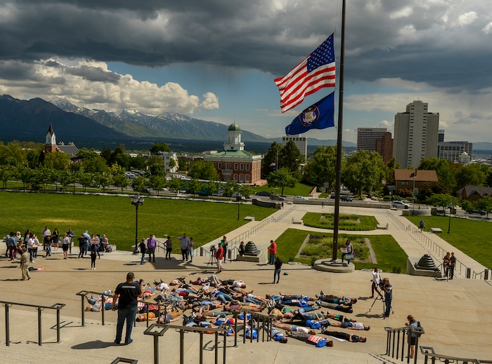(Leah Hogsten | The Salt Lake Tribune) Over 70 members of March For Our Lives SLC, high school students and concerned citizens gather at the Utah Capitol, Friday, May 18, 2018, to demand gun reform and honor the 10 dead who were killed during Friday morning's shooting spree inside Santa Fe High School in southeast Texas.The participants staged a 22-minute die-in for the 22 school shootings already in 2018.