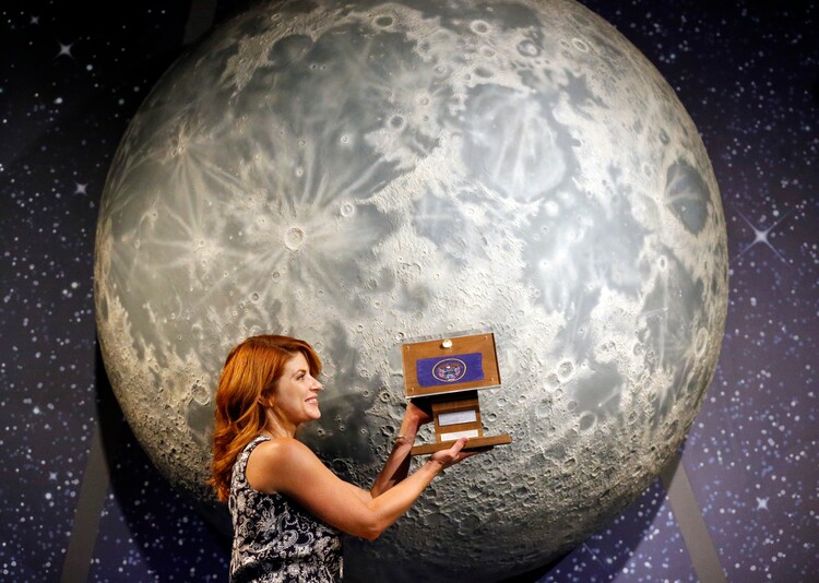 (Rick Bowmer | The Associated Press) In this Thursday, Aug. 23, 2018, photo, Lindsie Smith, from the Clark Planetarium, holds moon rocks encased in acrylic and mounted on a wooden plaque at the Clark Planetarium, in Salt Lake City. A former NASA investigator who has spent more than a decade tracking missing moon rocks is closing in on his goal of finding all 50 lunar samples gifted to U.S. states after Neil Armstrong's first steps on the moon. In recent weeks, two more of the moon rocks that dropped off the radar after the 1969 Apollo 11 mission have been located in Louisiana and Utah.