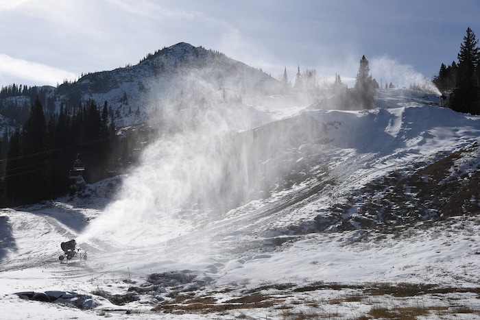 (Francisco Kjolseth | The Salt Lake Tribune) Solitude Resort makes snow on the slopes above Millie Express as they open for the season, Thursday, Nov. 15, 2018, with Majestic and Explorer lifts open.