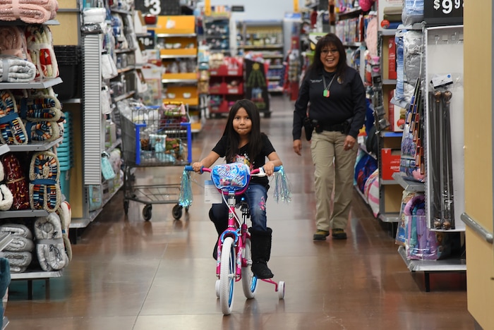 (Francisco Kjolseth | The Salt Lake Tribune) Unified police officer Shannon Coolack smiles as Ouraya Martinez, 7, rides a bicycle for the first time at a Walmart in Riverton while picking out toys during the Shopping With the Shield program on Saturday, Dec. 15, 2018.
