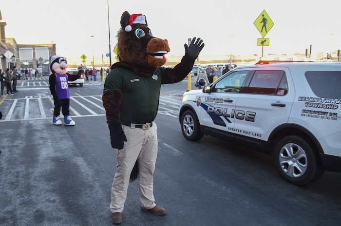 (Francisco Kjolseth | The Salt Lake Tribune) Sgt. Lightning waves to kids arriving in police cars for a Christmas shopping spree in Riverton as part of the Shopping with the Shield program on Saturday, Dec. 15, 2018.