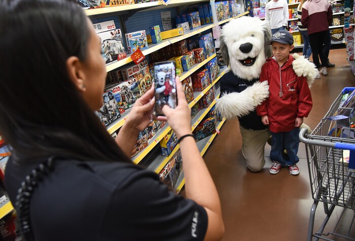 (Francisco Kjolseth | The Salt Lake Tribune) Officer Tiana Hunter snaps a picture of Sgt. Siren with Austin Quinney, 8. The Salt Lake County Sheriff's Office and Unified Police took 100 children Christmas shopping in Riverton as part of its Shopping with the Shield program on Saturday, Dec. 15, 2018.