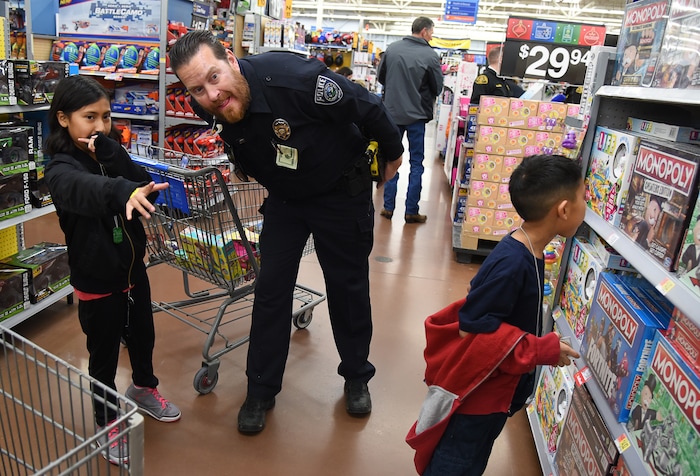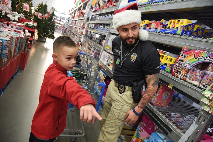 (Francisco Kjolseth | The Salt Lake Tribune) Andre Canham, 7, points out toys he might want as officer Omar Flores joins the fun. The Salt Lake County Sheriff's Office and Unified Police took 100 children Christmas shopping at a Walmart in Riverton as part of its Shopping with the Shield program on Saturday, Dec. 15, 2018. Officers grew beards, painted nails in festive colors and added color to their hair in an effort to raise funds for the event.