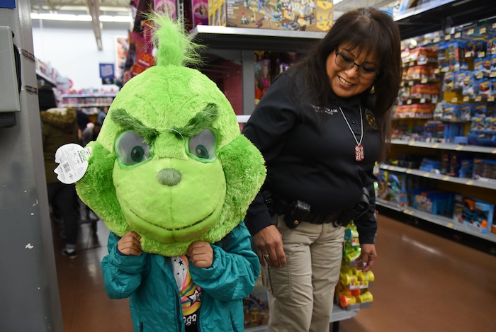 (Francisco Kjolseth | The Salt Lake Tribune) Unified police officer Shannon Coolack smiles as Ouraya Martinez, 7, tries on a Grinch mask and declares "I'm going to steal Christmas," during the Shopping with a Shield program on Saturday, Dec. 15, 2018 at a Walmart in Riverton.