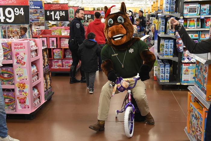 (Francisco Kjolseth | The Salt Lake Tribune) Sgt. Lightning honks a horn and rides around on a kids bike. The Salt Lake County Sheriff's Office and Unified Police officers pair up with kids and families for a Christmas shopping spree at Walmart in Riverton as part of Shopping with a Shield program on Saturday, Dec. 15, 2018.