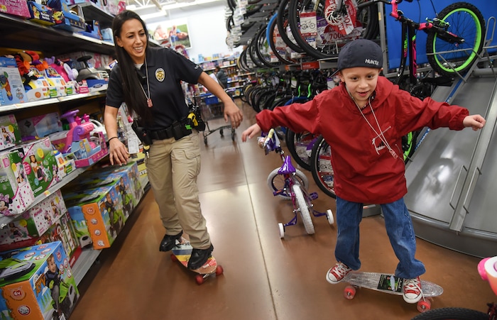 (Francisco Kjolseth | The Salt Lake Tribune) Officer Tiana Hunter tries her skateboarding skills alongside Austin Quinney, 8. The Salt Lake County Sheriff's Office and Unified Police took 100 children Christmas shopping in Riverton as part of its Shopping with the Shield program on Saturday, Dec. 15, 2018.