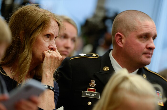 (Francisco Kjolseth | The Salt Lake Tribune) Major Brent Taylor's mother Tammy Taylor and her son Matthew, Brent's older brother, are moved by the vocal trio Gentri as they perform "One" as Brigham Young University honors the life and legacy of Major Brent Taylor, former mayor of North Ogden and a BYU Army ROTC alumnus during a ceremony at the Ernest L. Wilkinson Student Center in Provo on Thursday, May 23, 2019. The BYU Army ROTC updated their Memorial Wall, now containing 211 names of BYU students and alumni who have died in service.