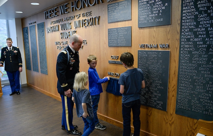 (Francisco Kjolseth | The Salt Lake Tribune) Major Brent Taylor's children Eleanor, 6, Jacob, 8, and Alex, 9, unveil their late father's name now added to the Wilkinson Student Center Reflection Room's Memorial Wall at Brigham Young University during a ceremony on Thursday, May 23, 2019. Major Brent Taylor, former mayor of North Ogden and a BYU Army ROTC alumnus who was killed in Afghanistan in 2018, was honored by the BYU Army ROTC as his name joins the list of BYU students and alumni who have died in service.