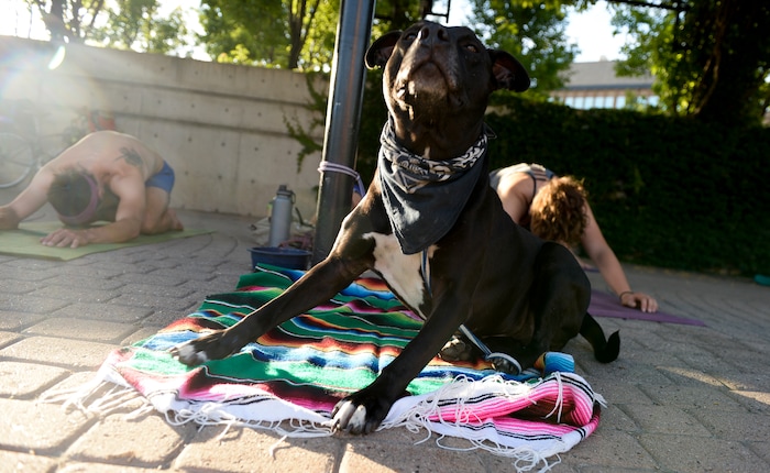 (Leah Hogsten | The Salt Lake Tribune) Tank gets into downward dog while his owner McKenna Delton gets into child's pose. Dozens of yoga enthusiasts filled the Ogden Amphitheater on Thursday, July 25, 2019 during the annual free yoga class sponsored by the Front Yoga Loft and The Front Climbing Club. Nine instructors from the Front Yoga Loft led the crowd as the music of guitarist Julian Alvarez played in the background.