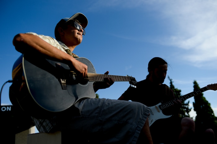 (Leah Hogsten | The Salt Lake Tribune) From left, Julian Alvarez plays acoustic guitar to the accompaniment of bassist John Abegglen. Dozens of yoga enthusiasts filled the Ogden Amphitheater on Thursday, July 25, 2019 during the annual free yoga class sponsored by the Front Yoga Loft and The Front Climbing Club.