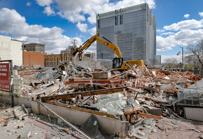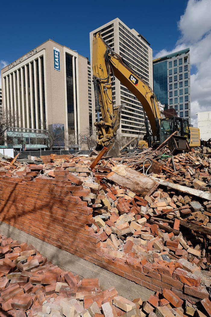 Crews take down the old Zephyr Club at 300 S. and West Temple in Salt Lake City on Thursday. Sources say the building had substantial roof damage, unrelated to the recent earthquake, and will be replaced for now with landscaping.