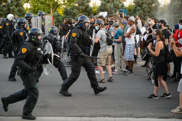 (Trent Nelson | The Salt Lake Tribune) Police push back protesters in Salt Lake City on Thursday, July 9, 2020.