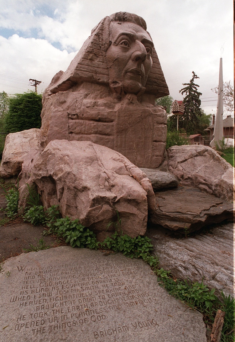 (Tribune file photo) Sphinx in Gilgal Garden in Salt Lake City includes image of Mormon founder Joseph Smith.