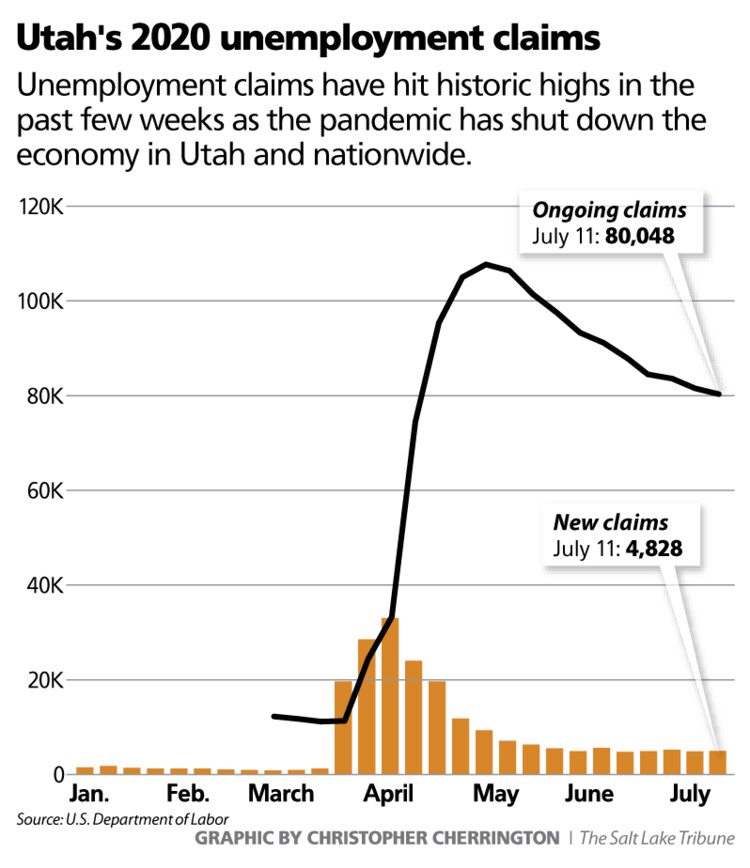 The agency said that 80,048 residents had ongoing unemployment claims as of last week, down by 1,497 claims the week prior — a further indication some Utahns are returning to work with the economy’s reopening.