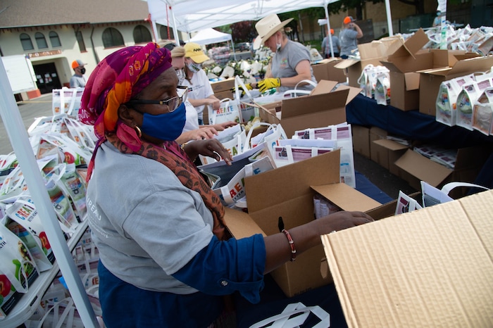 (Francisco Kjolseth | The Salt Lake Tribune) Habiba Nur helps assemble food bags as the third “Miracle Project” for the nonprofit foundation which raises money to purchase food produced by Utah farmers and then gives to residents in need, takes place at the Utah State Fairpark in Salt Lake City on Monday, July 27, 2020. The food donation from the Utah Farm Bureau’s “Farmers Feeding Utah” program provided food for 600 individuals and families who have recently become unemployed due to the coronavirus.
