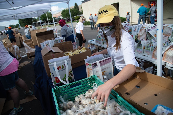 (Francisco Kjolseth | The Salt Lake Tribune) Paige Smith lends a helping hand as the third “Miracle Project” for the nonprofit foundation which raises money to purchase food produced by Utah farmers and then gives to residents in need, takes place at the Utah State Fairpark in Salt Lake City on Monday, July 27, 2020. The food donation from the Utah Farm Bureau’s “Farmers Feeding Utah” program provided food for 600 individuals and families who have recently become unemployed due to the coronavirus.