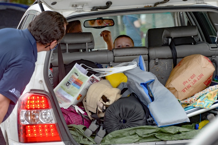 (Francisco Kjolseth | The Salt Lake Tribune) A young boy peeks out from the back seat as people load up the back of the car with food for the third “Miracle Project” for the nonprofit foundation which raises money to purchase food produced by Utah farmers and then gives to residents in need, takes place at the Utah State Fairpark in Salt Lake City on Monday, July 27, 2020. The food donation from the Utah Farm Bureau’s “Farmers Feeding Utah” program provided food for 600 individuals and families who have recently become unemployed due to the coronavirus.