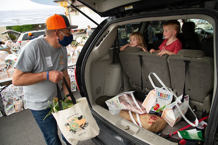 (Francisco Kjolseth | The Salt Lake Tribune) Potato farmer Bryan Searle is greeted by young kids as he loads a family’s car with food for the third “Miracle Project” for the nonprofit foundation which raises money to purchase food produced by Utah farmers and then gives to residents in need, takes place at the Utah State Fairpark in Salt Lake City on Monday, July 27, 2020. The food donation from the Utah Farm Bureau’s “Farmers Feeding Utah” program provided food for 600 individuals and families who have recently become unemployed due to the coronavirus.
