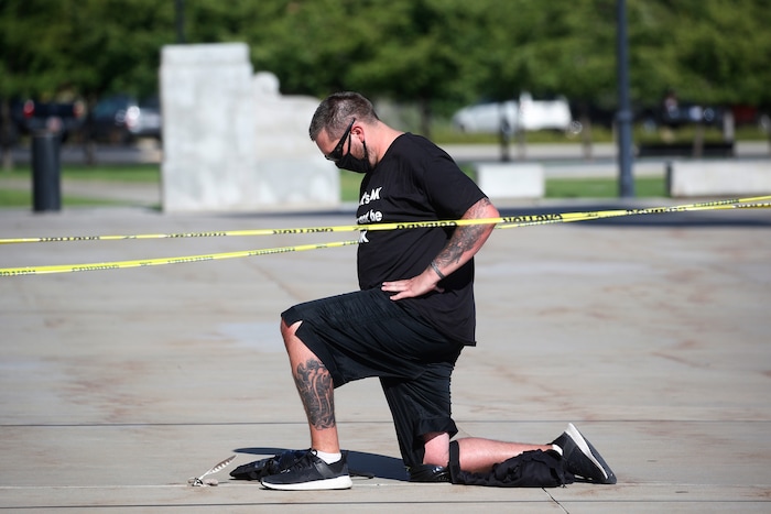 Shane Brooks, a Marine Corps veteran, kneels for nine hours outside the Utah Capitol to call attention to racial injustice, police brutality and mental health, Thursday, Aug. 6, 2020, in Salt Lake City. Brooks said people of color with mental illness are "looked at as if they have already committed a crime" and some end up dead in encounters with police, KTVX-TV reported. Brooks said his marathon silent protest was inspired by Bobby Duckworth, a 26-year-old who was shot and killed in 2019 by police responding to a report of a suicidal person in Wellington, Utah. (AP Photo/Rick Bowmer)