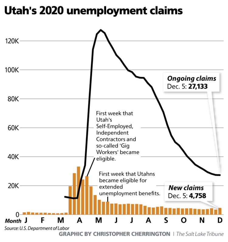 Some 4,758 residents sought jobless aid the week ending Dec. 5, including 1,364 Utahns who are applying for two federal aid programs about to expire in two weeks without further action from Congress.