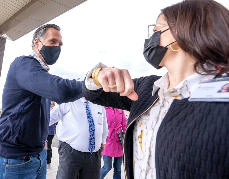 (Leah Hogsten | The Salt Lake Tribune) Sen. Mitt Romney, greets Shelly Rives, right, a Clinical Quality Director at Midtown Community Health Center during Romney's short visit to a COVID-19 vaccine clinic at the North Davis Senior Center, Mar. 26, 2021.