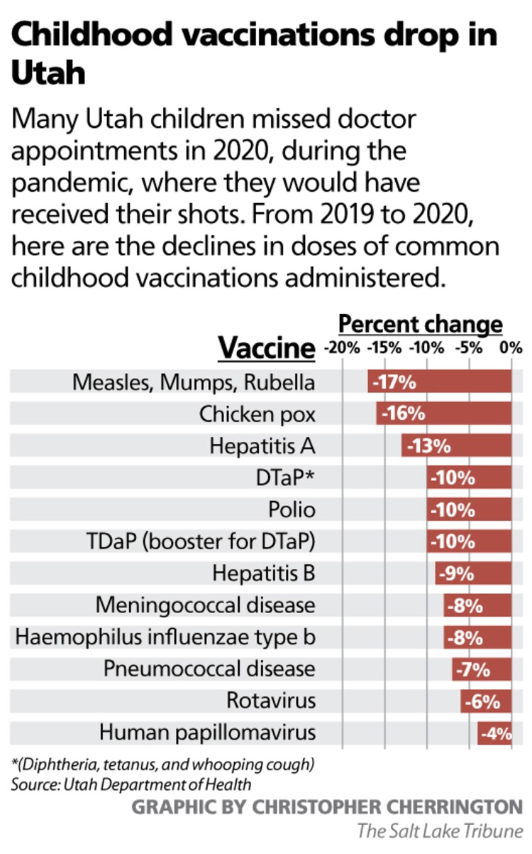 But with fewer kids vaccinated, a recurrence could mean not only that more Utahns get sick, but also that more children will have to miss even more school than they already have for COVID-19. State health rules require unvaccinated children to stay home, sometimes for weeks, if certain diseases are detected in schools.