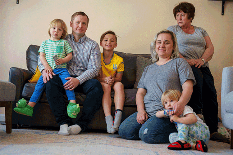 Their grandmother wrangles them as well, speaking in Russian to the girl as she plays with her bright purple dress. The oldest boy, wearing a yellow and blue soccer jersey, listens intently as his father talks about his life in Ukraine.