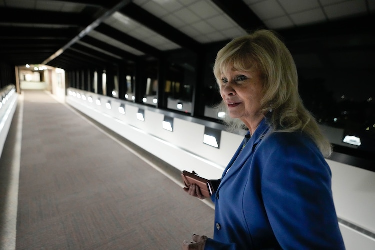Sherrie Swensen is so eager to reach her destination that she shoves her pink phone case into a gold-tinged elevator door to try to stop it from closing.
