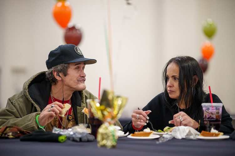 (Trent Nelson | The Salt Lake Tribune) "OG" Wayne and Barbara Regules have their Thanksgiving meal as the Miller family provides more than 3,000 meals for people experiencing homelessness at the Salt Palace Convention Center in Salt Lake City on Monday, Nov. 21, 2022.