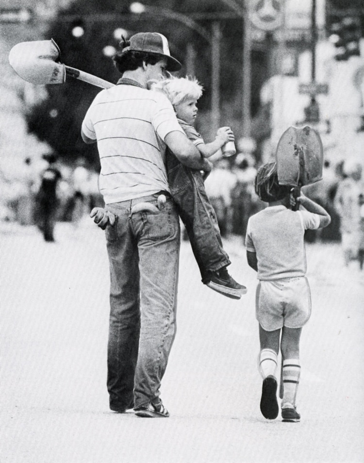 (The Salt Lake Tribune) Dave Cracroft and sons Jonathon and Justin walk up State Street to aid other volunteers during flooding in 1983.