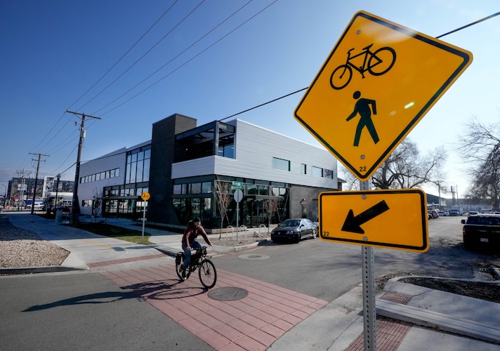 Construction workers drilled into the sidewalk on Tuesday afternoon as they prepared to install bicycle racks in front of the cavernous 19,058 square-foot building in Salt Lake City’s Central 9th neighborhood.