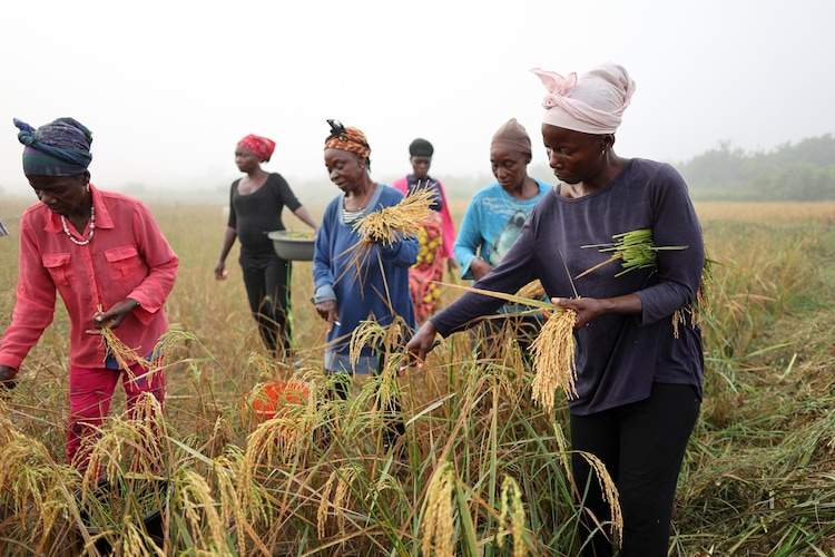 (The Church of Jesus Christ of Latter-day Saints) Farmers harvest rice in their fields at daybreak in Gbarnga, Liberia, on Friday, Jan. 20, 2024. They often sing as they harvest to demonstrate to unity and harmony within the community. The church reported giving $1.3 billion in charitable aid in 2023.