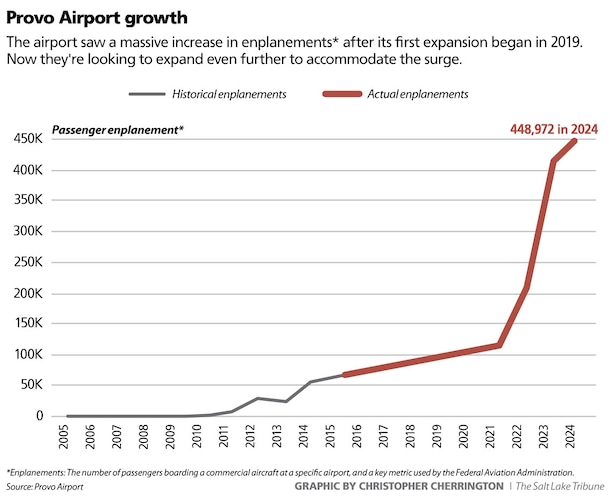 Since 2020, the airport’s demand has ballooned, surging from 77,217 “enplanements” (the number of people boarding a plane) up to 448,972 last year — a 481% increase. That makes Provo “the fastest growing commercial airport in the entire country,” said Brian Torgersen, Provo Airport’s director.
