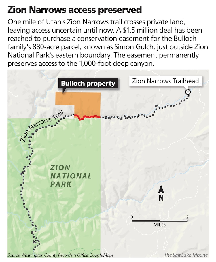For decades, the family allowed hikers to pass through the property known as Simon Gulch, but it posted “for sale” signs last year after the federal government lowballed the land’s value for a potential public acquisition. The impasse has now been broken with easements that shield the land from development and guarantee access to the Narrows forever, under agreements announced late Tuesday by The Trust for Public Land, which orchestrated the $1.5 million deal.