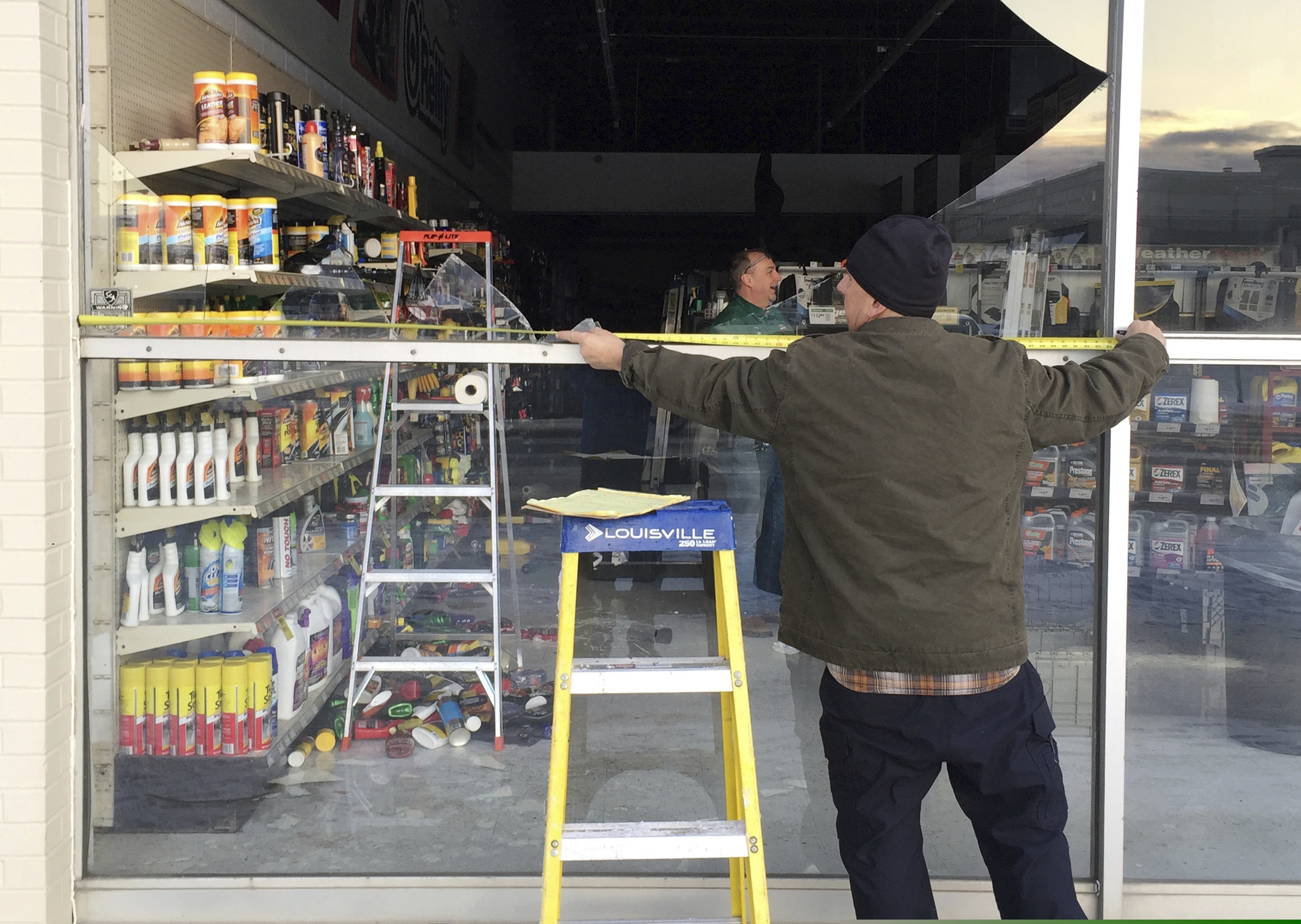 (Mike Dinneen | AP Photo) Dennis Keeling measures for a broken window at an auto parts store in Anchorage, on Friday, Nov. 30, 2018. Back-to-back earthquakes measuring 7.0 and 5.8 rocked buildings and buckled roads Friday morning in Anchorage, prompting people to run from their offices or seek shelter under office desks, while a tsunami warning had some seeking higher ground.