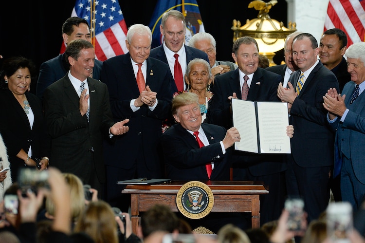 (Francisco Kjolseth | The Salt Lake Tribune) U.S. President Donald Trump is surrounded by Utah representatives at the Utah Capitol on Monday, Dec. 4, 2017, as he signs two presidential proclamations to shrink Bears Ears and Grand Staircase-Escalante national monuments.