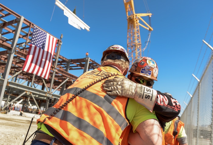 Leah Hogsten | The Salt Lake Tribune l-r Raising gang forman Kraig Iverson and rigger Samiu Loomu with Ironworkers Local 27 celebrate the placement of the last beam on the north concourse building with a hug. The Salt Lake International Airport redevelopment program celebrated another major milestone Tuesday as the last steel beam was raised on top of the north concourse. The "topping off" ceremony March 19, 2019 on the north concourse was similar to one that took place in May 2018 on the airport's central terminal. The practice of "topping off" is a Scandinavian religious rite of placing a tree atop a new building to appease the tree-dwelling spirits dispaced during construction.