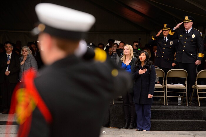 (Trent Nelson | The Salt Lake Tribune) Family and police stand at attention for a Flag Raising Ceremony at the dedication ceremony of the David P. Romrell Public Safety Building on Sunday Nov. 24, 2019. The building is named after Officer Romrell, who was killed in the line of duty on Nov. 24, 2018 - one year ago.