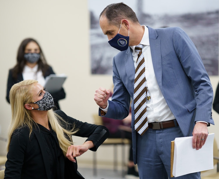 (Trent Nelson | The Salt Lake Tribune) Paris Hilton bumps elbows with Sen. Michael McKell, R-Spanish Fork, after a vote on SB-127 to the Senate Judiciary, Law Enforcement, and Criminal Justice Standing Committee in Salt Lake City on Monday, Feb. 8, 2021.