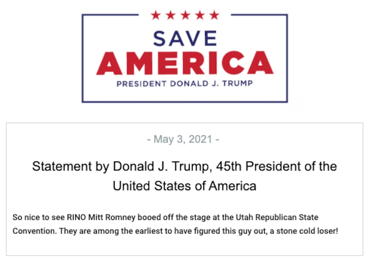 “So nice to see RINO Mitt Romney booed off the stage at the Utah Republican State Convention,” Trump wrote. “They are among the earliest to have figured this guy out, a stone cold loser.”