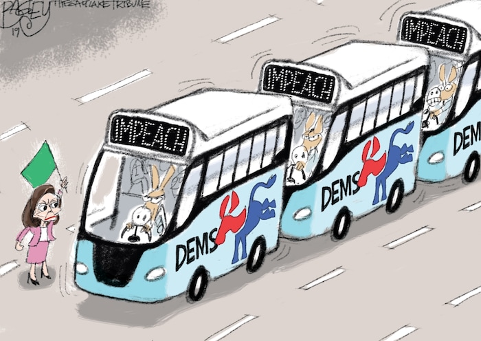 (Pat Bagley | The Salt Lake Tribune) This cartoon, titled "Wave Impeachment," appears in The Salt Lake Tribune on Friday, Oct. 11, 2019.