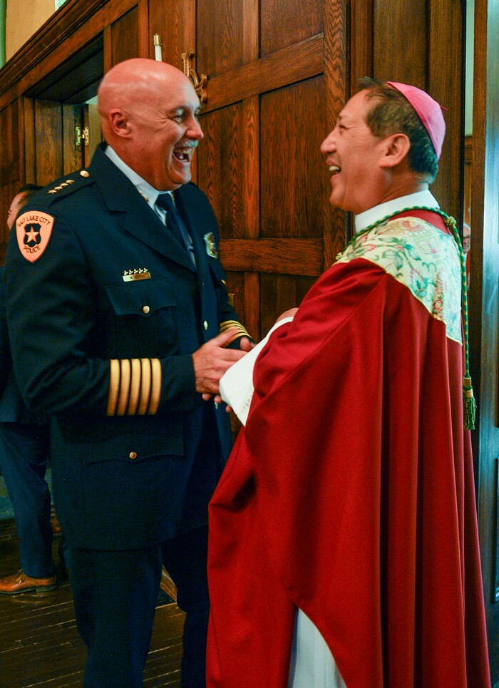 Leah Hogsten | The Salt Lake Tribune l-r Salt Lake City Police Chief Mike Brown and Bishop Oscar Solis share a laugh after The Feast of the Exaltation of the Holy Cross Red Mass, Friday, Sept. 14, 2018 at Cathedral of the Madeleine to recognize and honor first responders, members of the military and the legal professions for their service to the community.