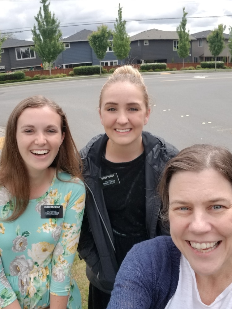 (Photo courtesy of Jennifer Roach) Latter-day Saint missionaries Mckenna Murdoch West, left, and Elizabeth Porter with Jennifer Roach.