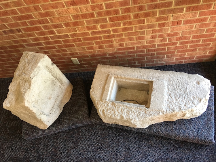 (The Community of Christ) The cornerstone of the Nauvoo House. The original manuscript of the Book of Mormon remained in Joseph Smith’s possession until 1841, when Latter-day Saints in Nauvoo, Ill., began building a temple (for worship) and the Nauvoo House (to entertain strangers). Joseph placed the original manuscript in the Nauvoo House cornerstone. Though the early Saints thought this would preserve the manuscript, the opposite happened. Over time, the documents became badly faded, obscured or otherwise damaged.